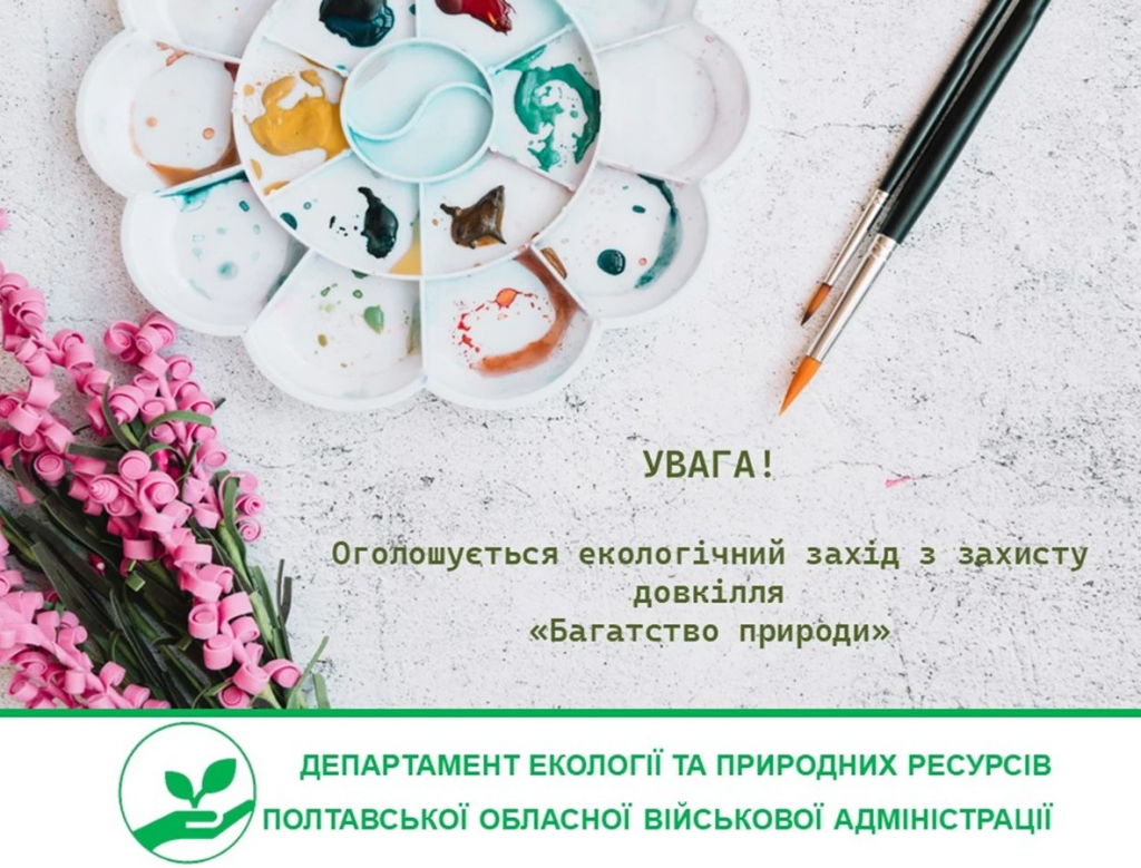 З метою привернення уваги до охорони довкілля та дбайливого ставлення до природних ресурсів, поширення екологічних знань, проведення просвітницької роботи, а також з нагоди Всеукраїнського дня навколишнього середовища, який цього року відбудеться 18 квітня, Департамент екології та природних ресурсів Полтавської ОВА оголосив проведення екологічного заходу із захисту довкілля «Багатство природи».