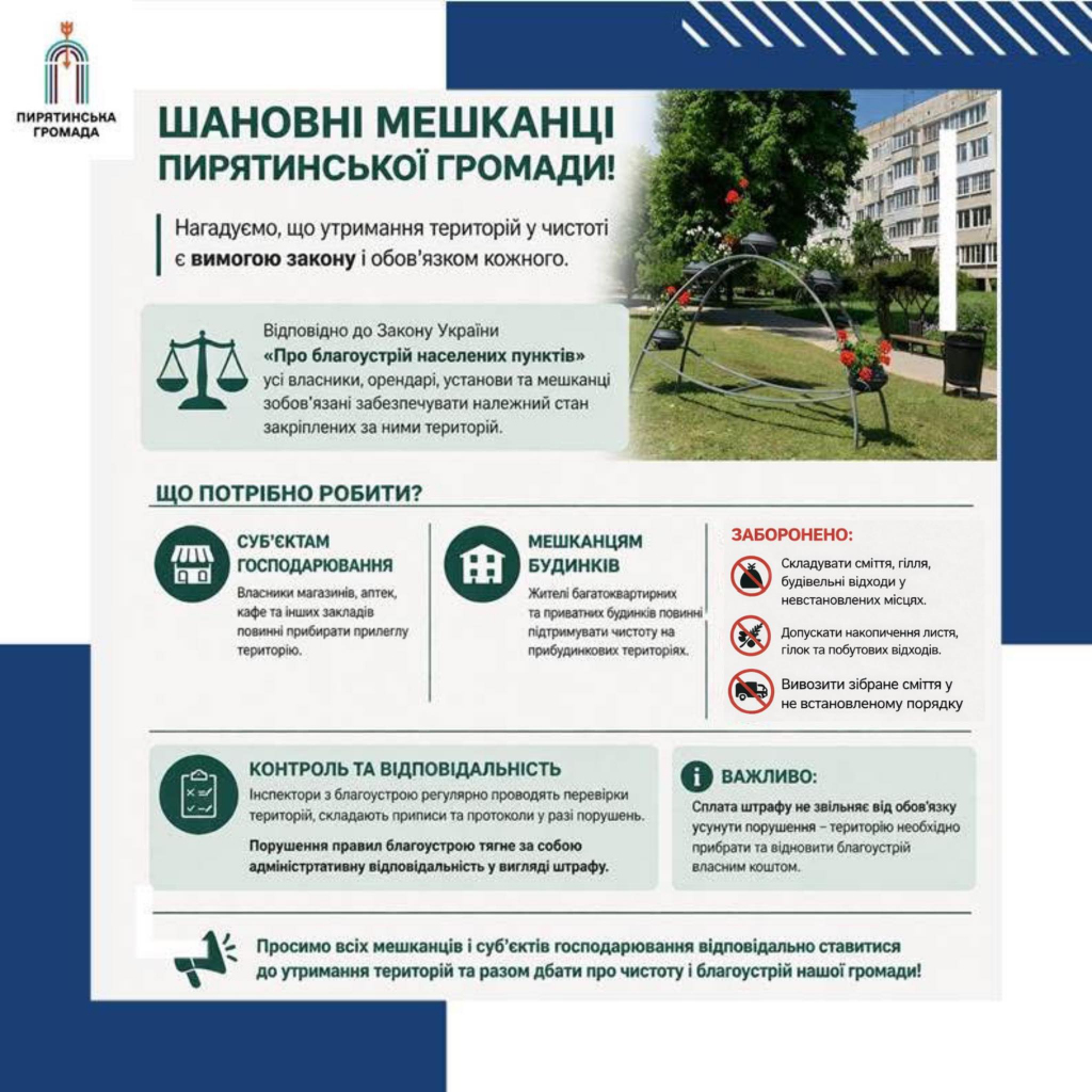 Нагадуємо: чистота в нашій громаді – це краса, комфорт і вимога Закону України «Про благоустрій населених пунктів».