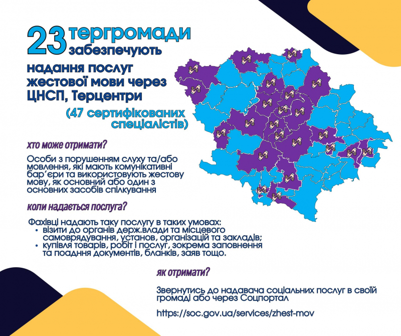«Наразі соціальну послугу перекладу жестової мови надають 47 сертифікованих фахівців на базі надавачів соціальних послуг 23 територіальних громад. Щороку понад 100 осіб, які мають порушення слуху та мовлення звертаються за підтримкою до територіальних центрів та центрів надання соцпослуг в своїх громадах. На базі деяких територіальних центрів жестову мову викладають в межах Університетів третього віку. Тому акцентуємо увагу громад на важливості розвитку цього інструменту безбар’єрної комунікації» - коментує Директор Департаменту соцзахисту населення ОВА Людмила Корнієнко.