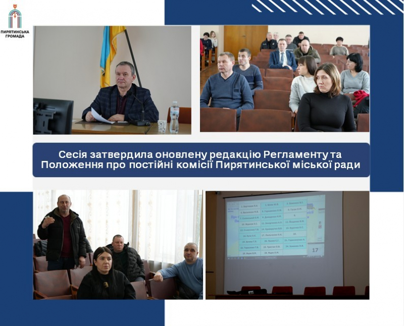 25 лютого під час чергового пленарного засідання сесії Пирятинської міської ради депутати затвердили оновлену редакцію Регламенту Пирятинської міської ради, а також Положення про постійні комісії Пирятинської міської ради.