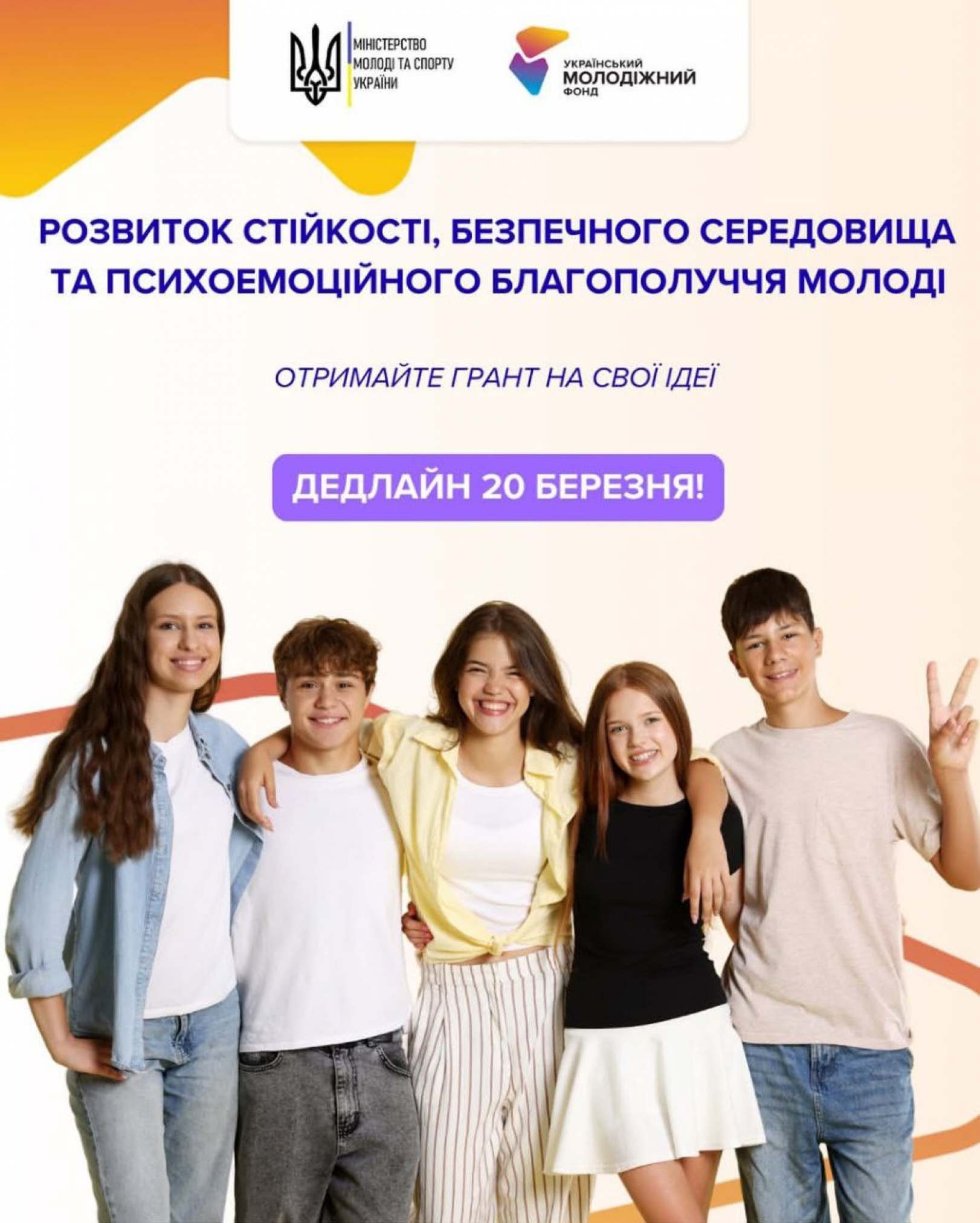 Конкурс за пріоритетним напрямом «Розвиток стійкості, безпечного середовища та психоемоційного благополуччя молоді» реалізується Міністерством молоді та спорту України і Українським молодіжним фондом.