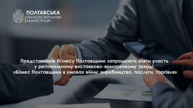 Запрошуємо представників бізнесу Полтавщини взяти участь у регіональному виставково-ярмарковому заході: «Бізнес Полтавщини в умовах війни: виробництво, послуги, торгівля», який відбудеться 26 березня 2026 року за адресою: м. Полтава, майдан Незалежності, 5, Виставкова зала міського будинку культури.