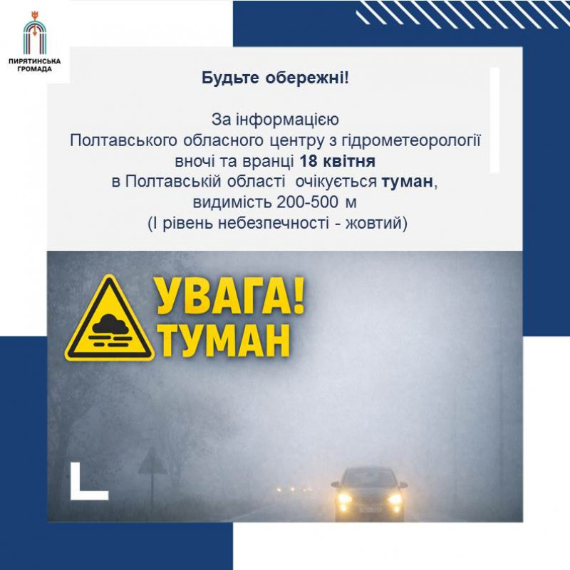 За інформацією Полтавського обласного центру з гідрометеорології вночі та вранці 18 квітня в Полтавській області туман, видимість 200-500 м (І рівень небезпечності - жовтий).