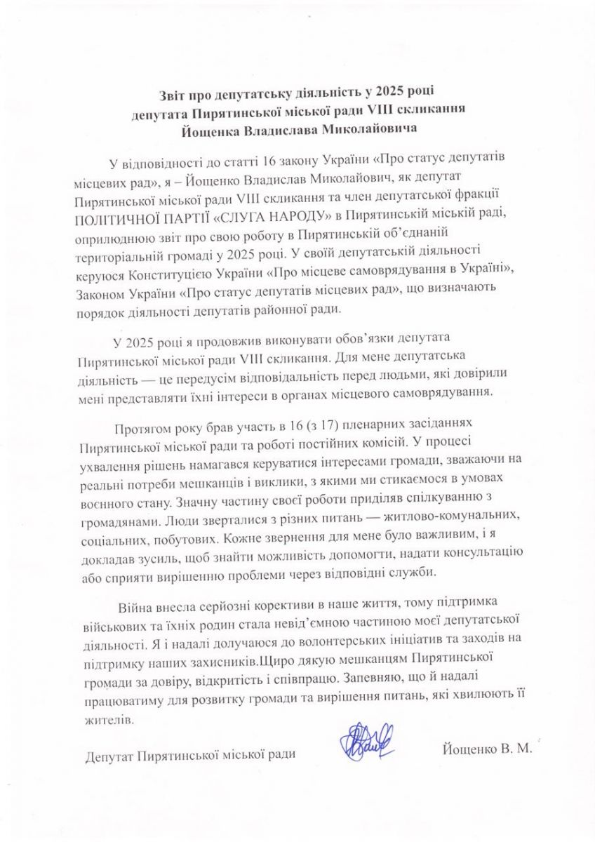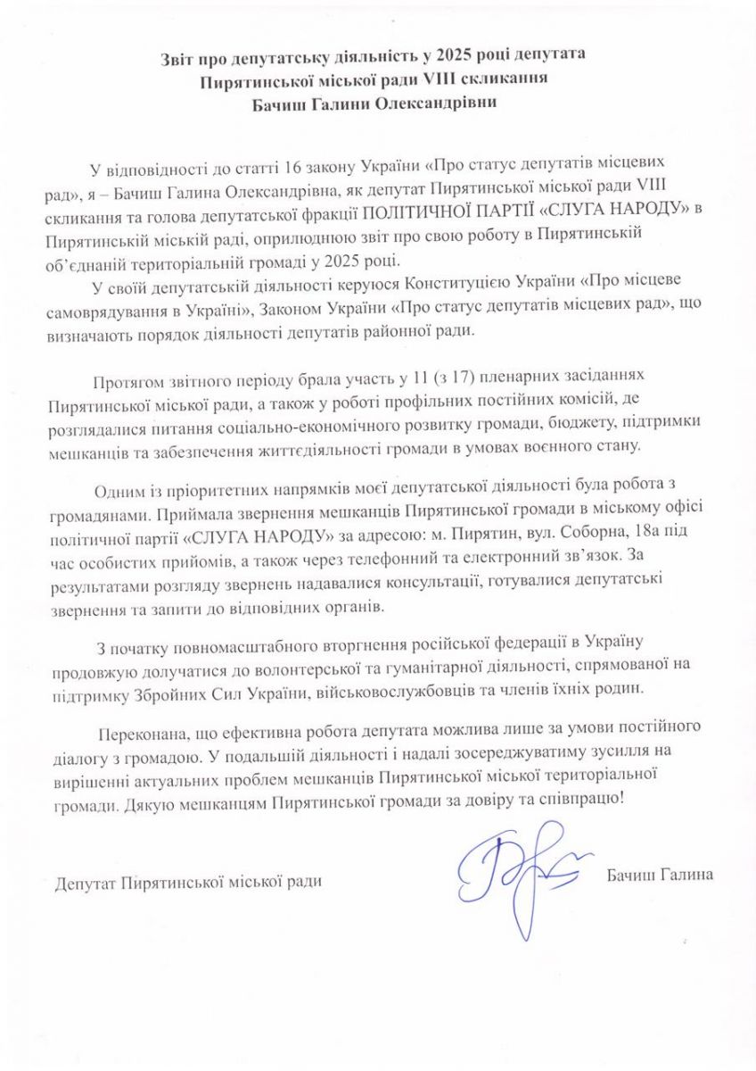 Звіт депутата Пирятинської міської ради восьмого скликання