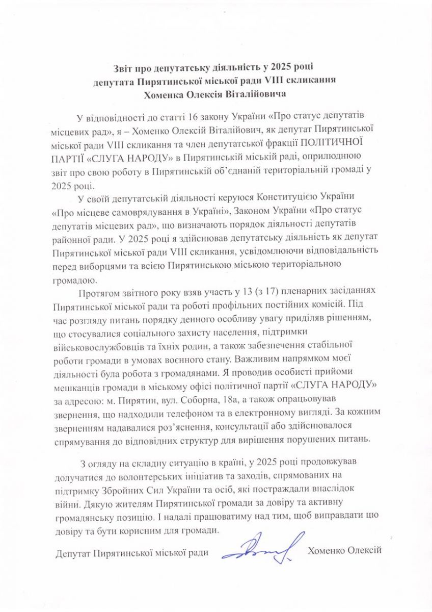 Звіт депутата Пирятинської міської ради восьмого скликання Олексія Хоменка про депутатську діяльність за 11 місяців 2023 року